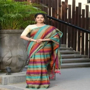 Stripes khadi cotton sarees with embossed jari & with running plain blouse.