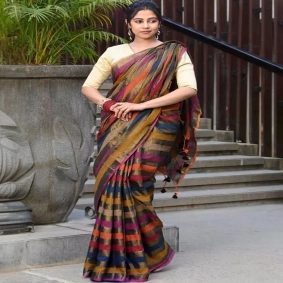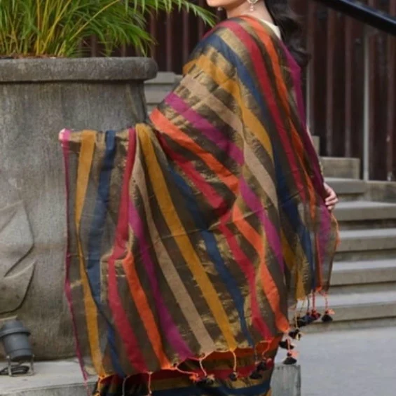 The multi-color stripes khadi saree is a perfect blend of tradition and vibrance, featuring handwoven stripes in rich, earthy tones. Its soft khadi fabric offers both comfort and elegance, making it ideal for everyday wear or festive occasions. The colorful stripes add a modern twist to the classic khadi weave, reflecting India’s artistic craftsmanship. Lightweight and breathable, this saree drapes beautifully and complements all skin tones. A timeless piece, it celebrates simplicity with a splash of color and culture.